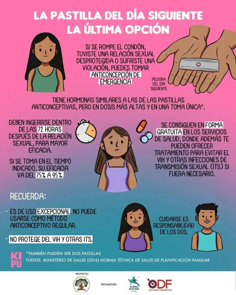 Esta infografía explica el uso de la anticoncepción de emergencia ante situaciones como la ruptura del condón, relaciones desprotegidas o violación. El documento resalta que debe ingerirse dentro de las 72 horas posteriores para asegurar una eficacia de entre el 75% y 95%, y que puede obtenerse gratuitamente en centros de salud, donde también se ofrece tratamiento para prevenir el VIH e ITS. Finalmente, aclara que es de uso excepcional, no funciona como método regular y su efectividad es responsabilidad compartida de la pareja.