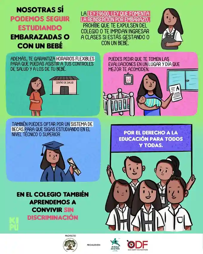 Esta infografía informa sobre la Ley 29600, la cual garantiza el derecho de las adolescentes embarazadas o con hijos a continuar sus estudios sin ser expulsadas ni discriminadas. El documento destaca beneficios clave como la flexibilidad de horarios para controles médicos, la posibilidad de elegir fechas para evaluaciones y el acceso a sistemas de becas para niveles técnicos o superiores. Finalmente, enfatiza que los colegios deben ser espacios de convivencia inclusiva que protejan el derecho a la educación para todos y todas.