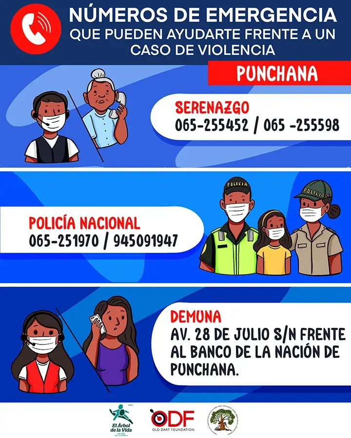 Esta infografía brinda información sobre los números de emergencia a los cuales acudir ante un caso de violencia en el distrito de Punchana