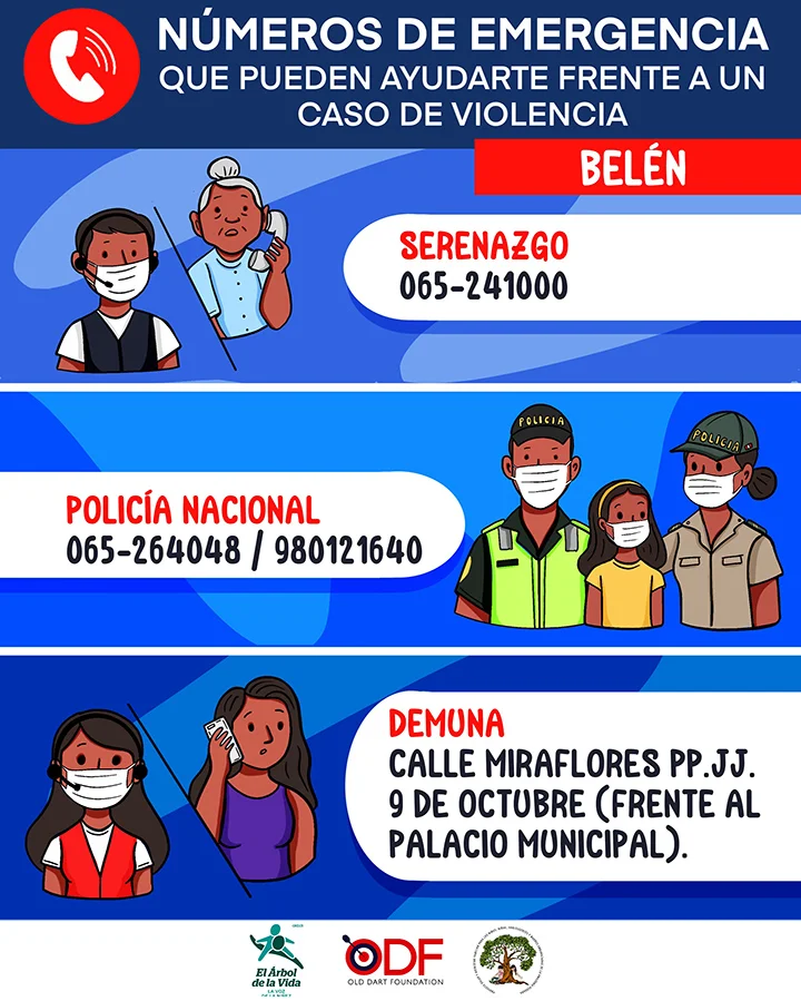 Esta infografía brinda información sobre los números de emergencia a los cuales acudir ante un caso de violencia en el distrito de Belén