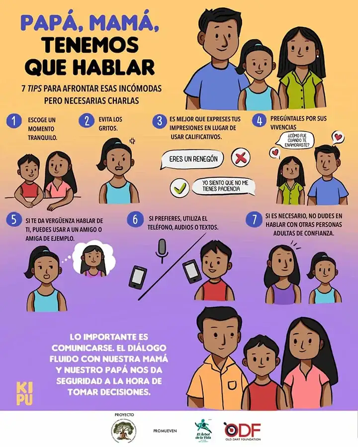Esta infografía ofrece siete consejos prácticos para que los jóvenes afronten conversaciones difíciles pero necesarias con sus padres, fomentando un diálogo fluido que les brinde seguridad al tomar decisiones. La guía recomienda buscar momentos tranquilos, evitar gritos, expresar sentimientos personales en lugar de usar calificativos y apoyarse en medios como el teléfono o personas adultas de confianza si la comunicación directa resulta complicada.