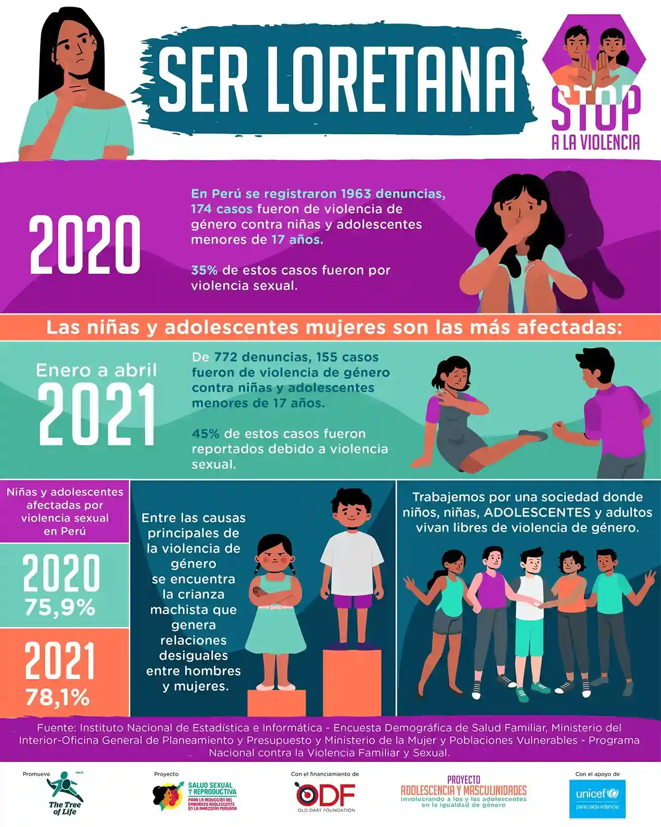 Esta infografía visibiliza la violencia de género que afecta a niñas y adolescentes en el Perú, con un enfoque particular en las alarmantes cifras de violencia sexual. El documento detalla que en 2020 se registraron 1,963 denuncias, de las cuales el 35% correspondió a violencia sexual contra menores de 17 años, tendencia que se mantuvo al alza durante los primeros meses de 2021. Finalmente, señala a la "crianza machista" como una de las causas principales de estas desigualdades y hace un llamado urgente a construir una sociedad libre de violencia para todas las edades.